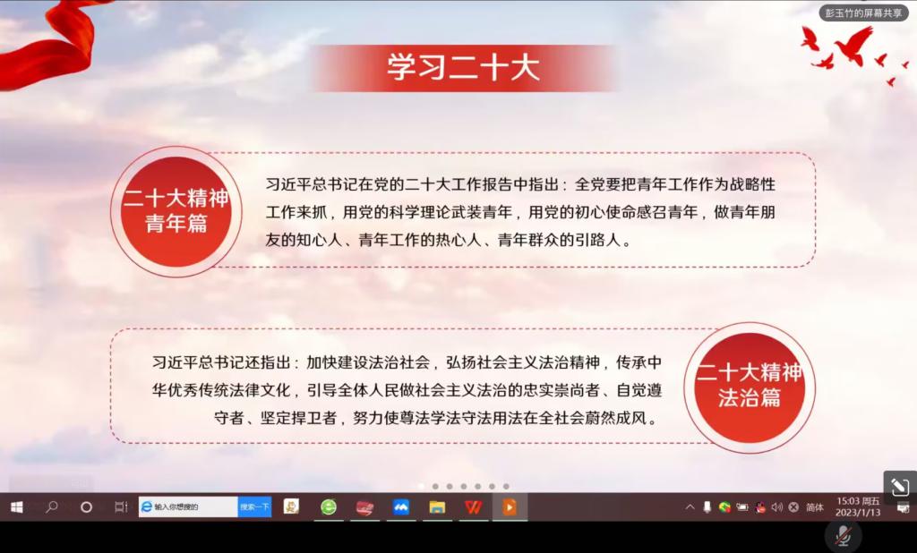 1月13日,英国上市官网365邀请校青年讲师团作党的二十大精神主题宣讲。青年讲师团成员、法学专业2020(1)班的彭玉竹围绕“生逢其时更要奋斗其时”的主题作报告。此次宣讲以线上方式开展,公司2022级各班员工代表和员工会全体成员聆听学习。