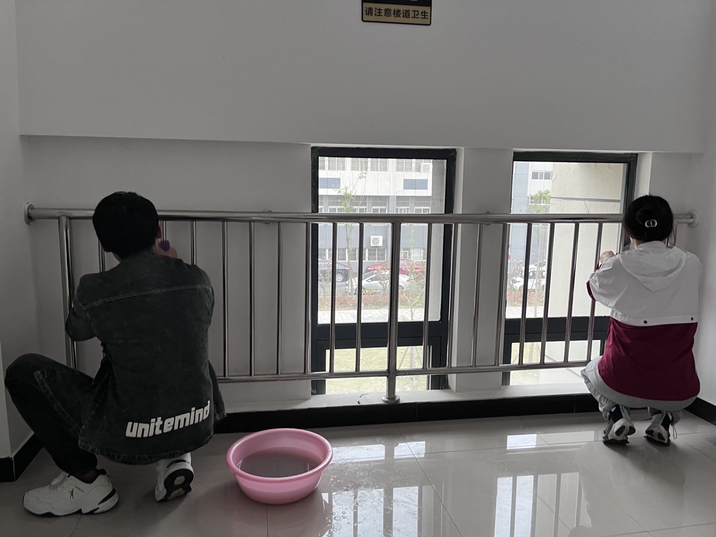 在师生们的相互配合下,清扫工作有条不紊地开展。一眼望去,从大厅入口到教室,从楼道口到模拟法庭,从教研室到办公走廊,师生忙碌的身影成为英国上市官网3650楼一道独特的“风景线”。有序的清扫如火如荼地进行,有的三人一组用抹布轻轻擦拭门窗与玻璃;有的同学用拖把打扫教室地面;有的同学认真清理楼梯间杂物,有的老师用铲子清理门窗的污迹。大家各有分工、齐心协力,利用拖把抹布铲子,狠抓细节,不留死角。