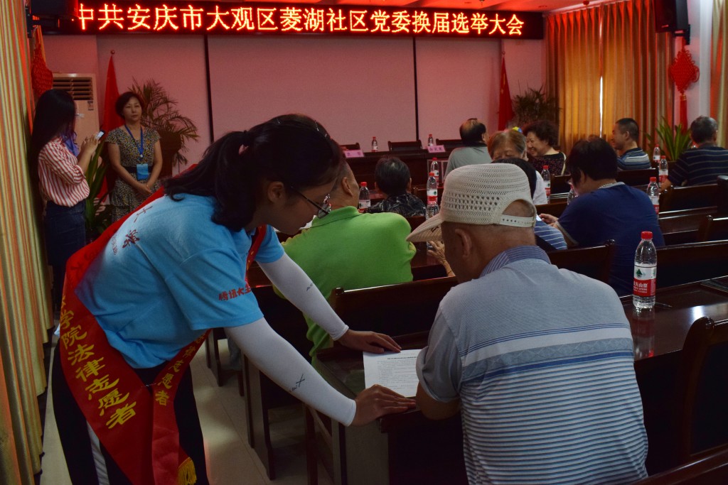 党委换届大会开始前,服务队针对会场内的党员干部开展了《选举法》和《村民委员会组织法》等相关的专项法治宣传活动,认真宣传《刑法》、《治安管理处罚法》等法律法规,使人民群众自觉维护选举秩序,坚决抵制各种破坏选举的行为,让各位基层群众更加明确了自身责任的重大,增强了其责任意识。此外,成员们还开展了多项便民措施服务党员和选民依法选举、民主选举,积极服务和保障社区党委换届选举工作的正常进行。