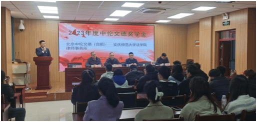 颁奖仪式上,李丹对中伦文德合肥所各位合伙人、律师的到来表示热烈欢迎和衷心感谢。中伦文德合肥所胡清律师简要介绍了中伦文德合肥律所的发展历程、律所文化及“中伦文德奖学金”设立的背景、初衷。员工胡清、王宏权律师宣布陈润一、陈翔宇、王蓉蓉等11位2020级法学专业本科生,潘汉林、李诚、陆晓雨等11位2023级法律硕士班员工,获得2023年度中伦文德奖学金,胡清、汪剑、王宏权等律师向获奖同学逐一颁发荣誉证书。