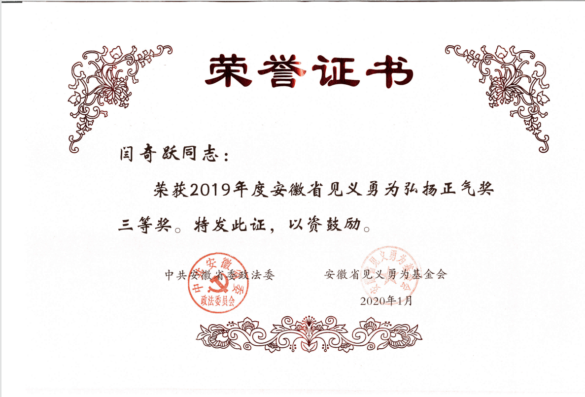 闫奇跃,男,汉族,中共党员,英国上市官网3652006届法学专业优秀员工。现任安庆市财政局社保科干部。2020年1月,获2019年度安徽省见义勇为弘扬正气奖三等奖!2019年7月,闫奇跃当选“安庆好人”。