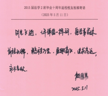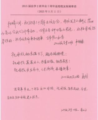 与会员工纷纷发言,回忆了在校学习的点滴时光,畅谈毕业十年间的工作经历与人生感悟。一位员工表示,“这是毕业十年第一次回家,母校的教诲让我始终铭记法律人的责任与担当,十分感谢母校的培养为我们奠定了坚实的职业基础。”员工们结合自身在司法机关、律所以及企业法务岗位的工作经验,围绕法学实践教学、校企协同育人、员工资源共享等提出了宝贵的建议和意见,现场气氛热烈融洽。活动还特别设置了“手写祝福寄语”环节,员工们在明信片上写下对母校的祝愿与对学弟学妹的期许,字字真挚,句句情深。