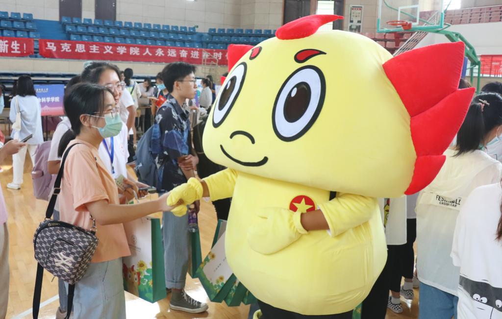 “哇!我们公司的吉祥物也太可爱啦!”“我想和吉祥物合影!”9月15日,在公司体育馆新生报道处,身着玩偶衣的吉祥物“小角”正和员工热情互动,这是公司在迎接2021级新生。