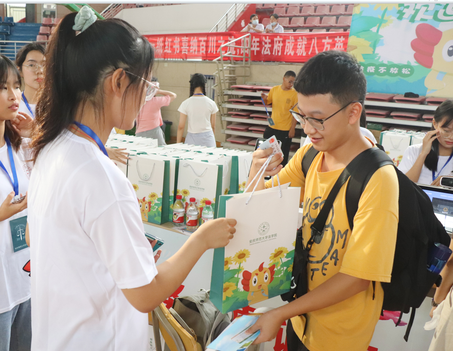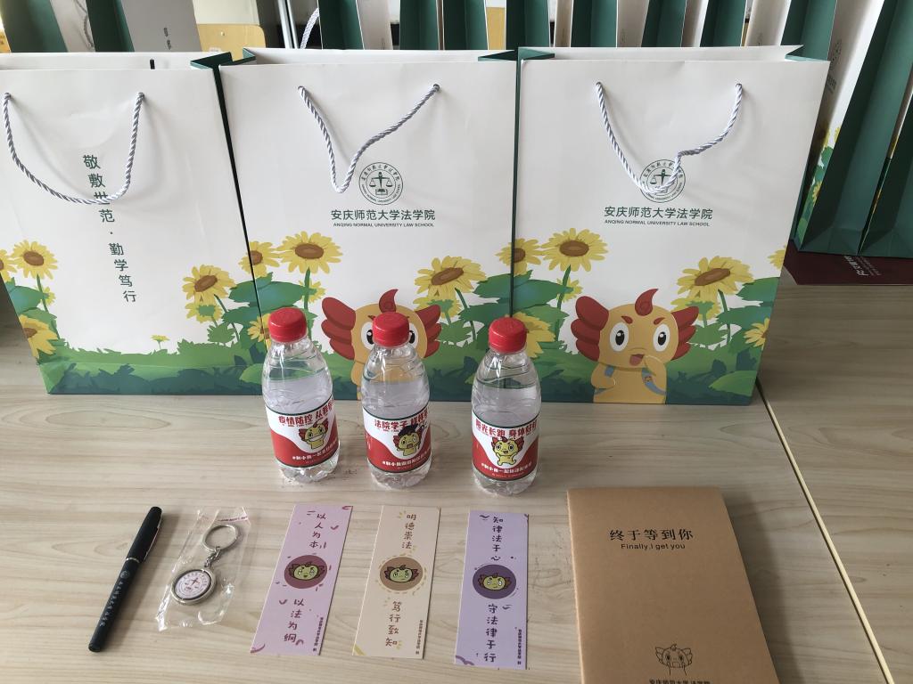 “看到学长学姐们精心准备的礼物很感动也很暖心,学长学姐们也都特别的热情,让我刚来的紧张都消失了。”法学专业2021(3)班的黄文蓉边说边打开了新生礼包,里面是公司专门定制的印有吉祥物“小角”图案的笔记本、笔、书签、钥匙扣等物品, 其中专门定制并印有“疫情防控 从我做起”、“阳光长跑 身体好好”和“法院学子 样样第一”字眼的矿泉水更坚定了小萌新们做好疫情防控、参加体育锻炼和努力刻苦学习的信心。