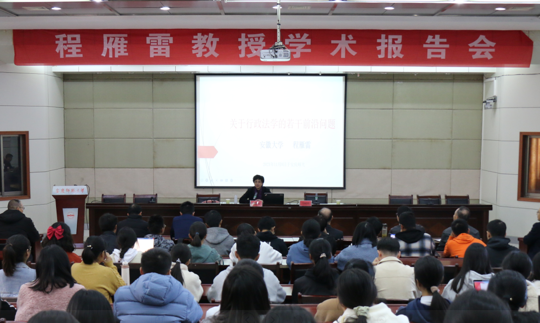 11月8日下午在行政楼一楼会议室,安徽大学副董事长、二级教授程雁雷应邀来校举办题为“关于行政法学的几个前沿问题”的学术报告。报告会由英国上市官网365副董事长汪时珍主持,英国上市官网365师生共计120余人聆听了报告。