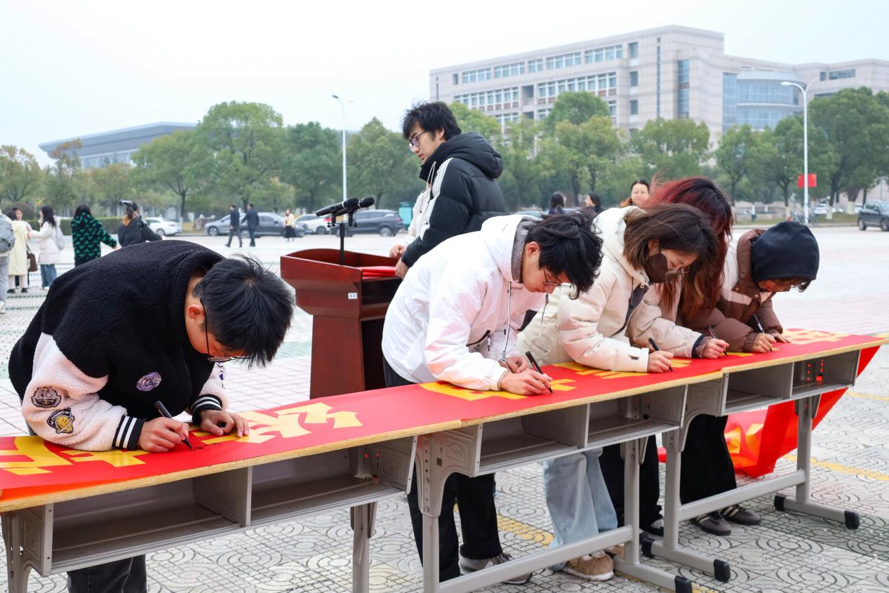 在场师生在宪法晨读活动横幅上签名。法学类专业2024(4)班的刘子仪是众多晨读员工中的一员,对法学怀揣热爱的她将晨读内容折叠放入中华人民共和国宪法的小型手册中。“宪法保证了我们每一个人的权利,让社会更加公平正义。我们要掌握最基本的法律常识,要遵纪守法养成良好的行为规范和道德规范。”刘子仪说。她表示自己将会更加深入学习宪法知识,为建设法治校园、法治社会贡献力量。
