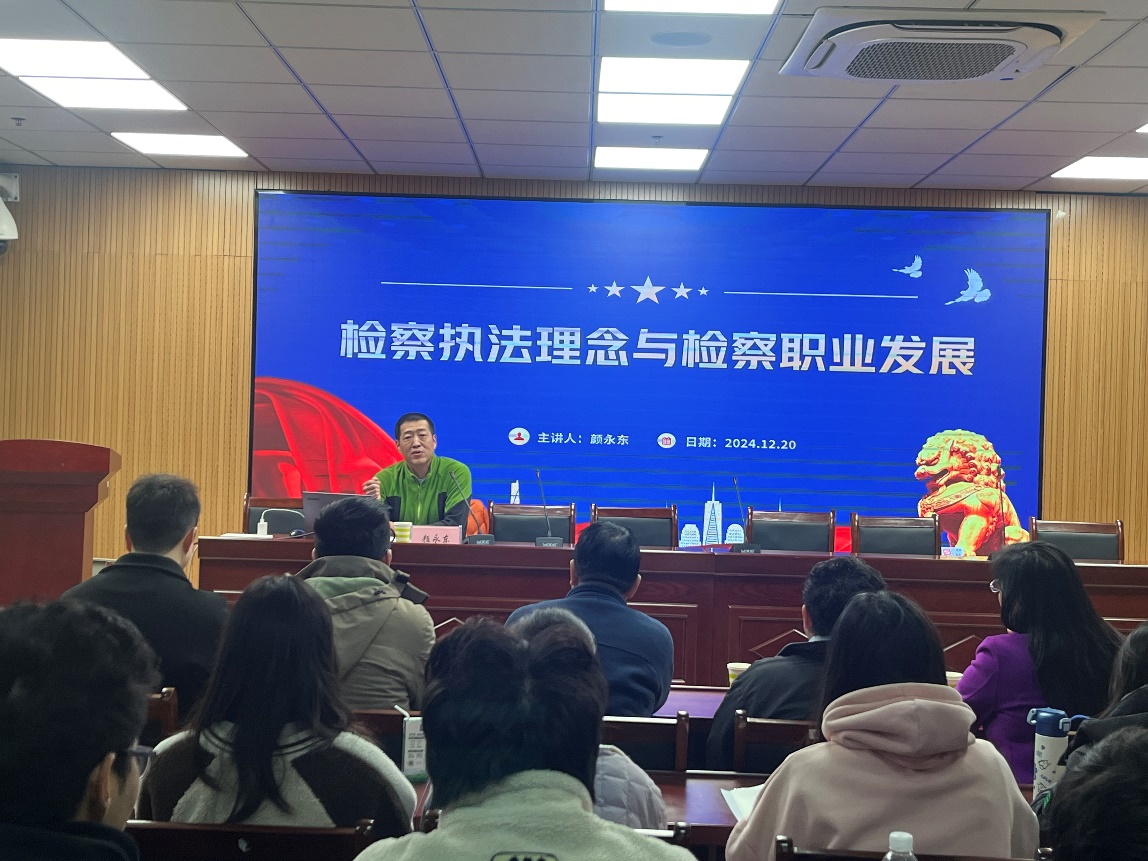 颜永东从“执法理念——正能量”和“检察职业发展”两个方面展开。他指出,执法人员在执法过程中要讲究正能量,并且结合实务案例指出应当秉持“平等、谦抑、正义、善意规范理念”。他从职业构成、成为检察官的必要和附加条件提出具备检察职业的重要因素,他以“四大检察、十大业务”八个字高度概括了检察机关的工作内容。报告会上,颜永东以个人为例,畅谈了检察官行业发展前景、个人发展路径、职业就业趋势等检察职业发展相关问题,他提出,检察官应当具备善良、正义、清廉、担当的人格要求。