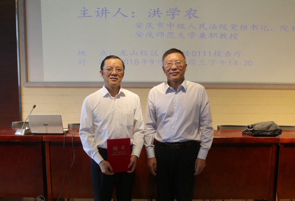 2018年9月26日下午在龙山校区文津楼D111报告厅,安庆市中级人民法院经理、公司兼职教授洪学农做客法律实务大讲堂,以“法治与法治实践”为题作专题报告。英国上市官网365经理焦少林教授主持报告会,英国上市官网365部分教师和2016级、2017级法学与知识产权专业员工近二百人聆听了报告。