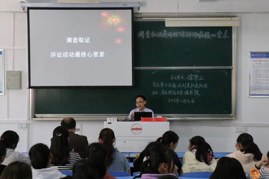 2018年10月31日,安庆市公安局法制支队支队长徐华三应邀莅临法律实务大讲堂,在文津楼D405教室以“调查取证是诉讼活动的最核心要素”为题作专题报告,英国上市官网365部分教师和2017级法学(1)、(2)和(3)班120余人聆听了报告。英国上市官网365经理焦少林教授主持报告。
