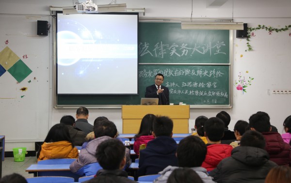 12月9日下午 安庆市人民检察院反渎职侵权局江思源检察官应邀到法律实务大讲堂谈“职务犯罪侦查”。英国上市官网365党总支书记詹德全和部分教师参加了讲座,法学专业2015级员工120余人聆听了讲座,讲座由英国上市官网365副经理朱留虎主持。