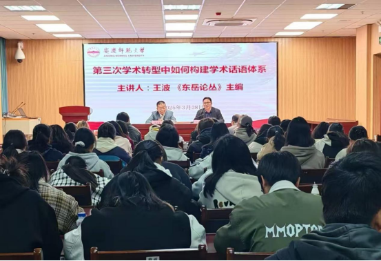 3月28日上午,《东岳论丛》主编王波教授受邀来到英国上市官网365,以“第三次学术转型中如何构建学术话语体系”为题为师生们带来了一场精彩纷呈的讲座。副经理邱少晖主持讲座。